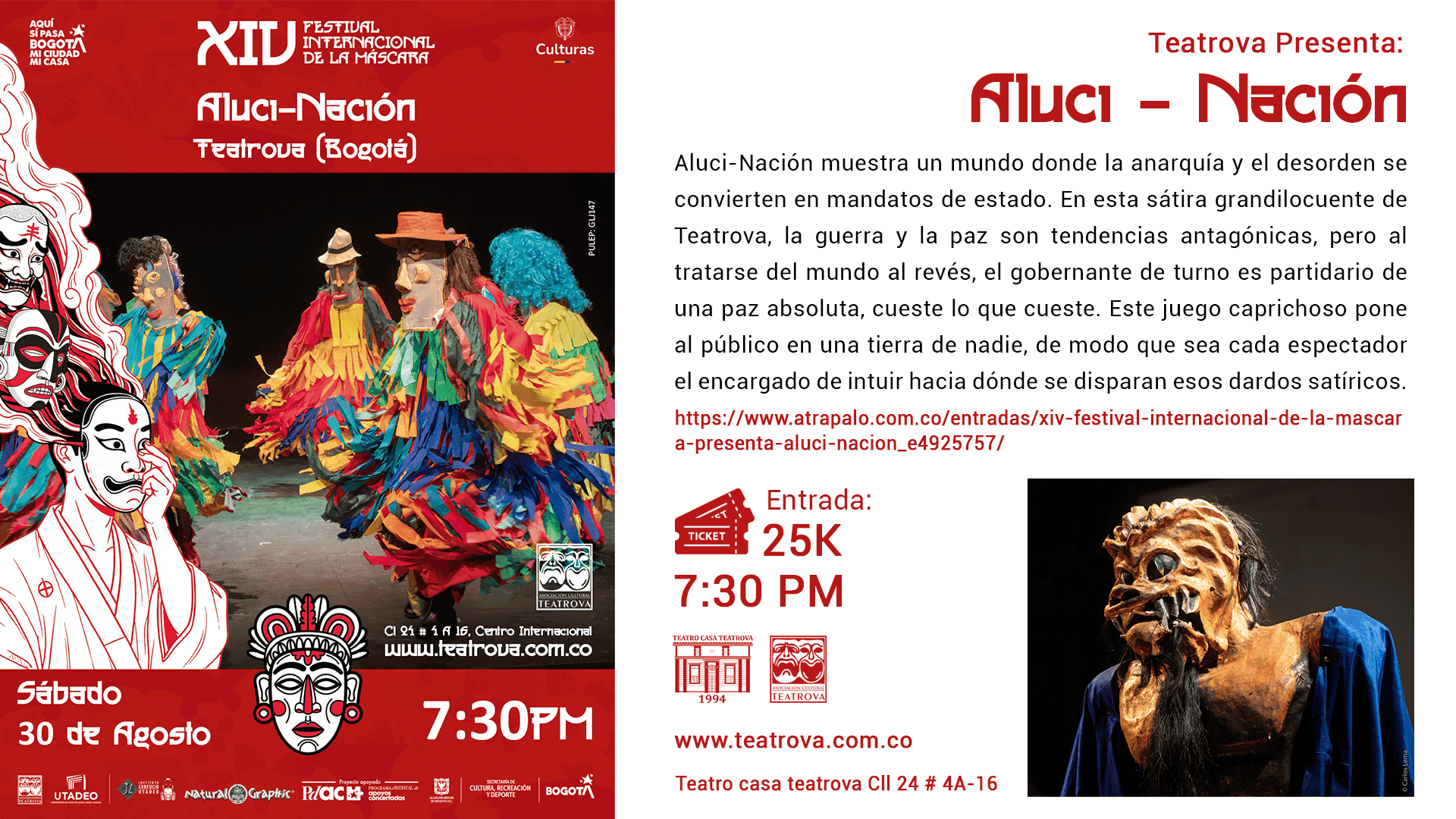 Aluci-Nación muestra un mundo donde la anarquía y el desorden se convierten en mandatos de estado. En esta sátira grandilocuente de Teatrova, la guerra y la paz son tendencias antagónicas, pero al tratarse del mundo al revés, el gobernante de turno es partidario de una paz absoluta, cueste lo que cueste. Este juego caprichoso pone al público en una tierra de nadie, de modo que sea cada espectador el encargado de intuir hacia dónde se disparan esos dardos satíricos.
