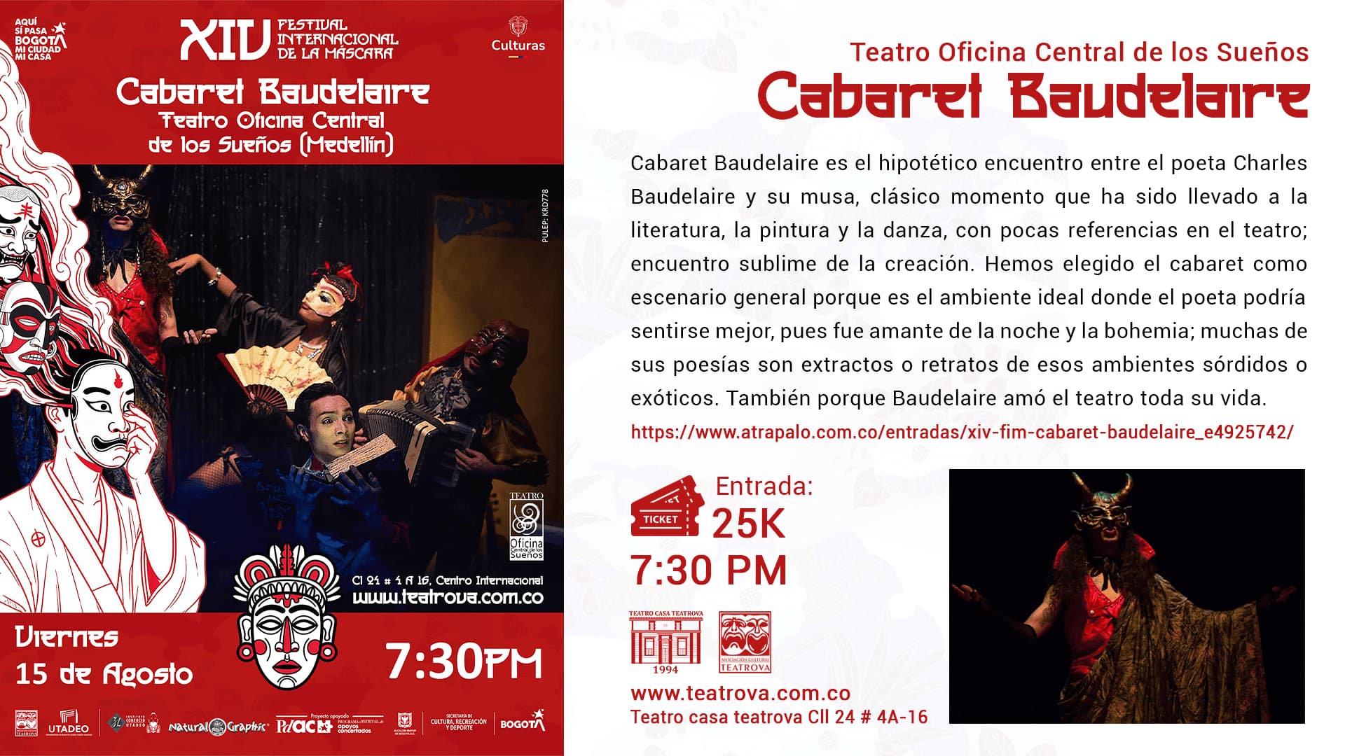 Cabaret Baudelaire es el hipotético encuentro entre el poeta Charles Baudelaire y su musa, clásico momento que ha sido llevado a la literatura, la pintura y la danza, con pocas referencias en el teatro; encuentro sublime de la creación. Hemos elegido el cabaret como escenario general porque es el ambiente ideal donde el poeta podría sentirse mejor, pues fue amante de la noche y la bohemia; muchas de sus poesías son extractos o retratos de esos ambientes sórdidos o exóticos. También porque Baudelaire amó el teatro toda su vida.