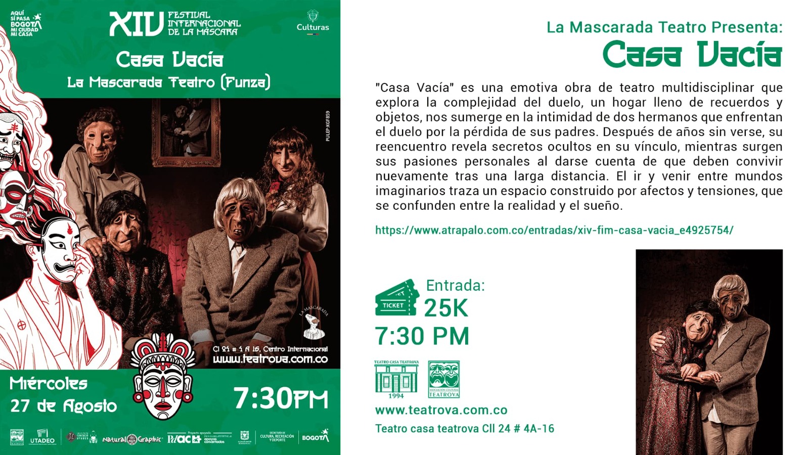 “Casa Vacía” es una emotiva obra de teatro multidisciplinar que explora la complejidad del duelo, un hogar lleno de recuerdos y objetos, nos sumerge en la intimidad de dos hermanos que enfrentan el duelo por la pérdida de sus padres. Después de años sin verse, su reencuentro revela secretos ocultos en su vínculo, mientras surgen sus pasiones personales al darse cuenta de que deben convivir nuevamente tras una larga distancia. El ir y venir entre mundos imaginarios traza un espacio construido por afectos y tensiones, que se confunden entre la realidad y el sueño.