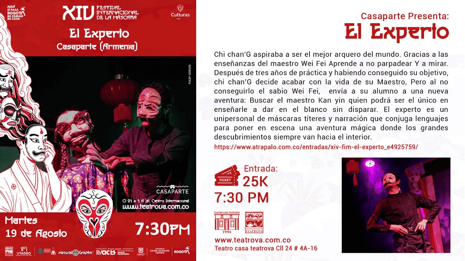 Chi Chan’G aspiraba a ser el mejor arquero del mundo. Gracias a las enseñanzas del maestro Wei Fei Aprende a no parpadear Y a mirar. Después de tres años de práctica y habiendo conseguido su objetivo, Chi Chan’G decide acabar con la vida de su Maestro, Pero al no conseguirlo el sabio Wei Fei, envía a su alumno a una nueva aventura: Buscar el maestro Kan yin quien podrá ser el único en enseñarle a dar en el blanco sin disparar. El experto es un unipersonal de máscaras títeres y narración que conjuga lenguajes para poner en escena una aventura mágica donde los grandes descubrimientos siempre van hacia el interior.